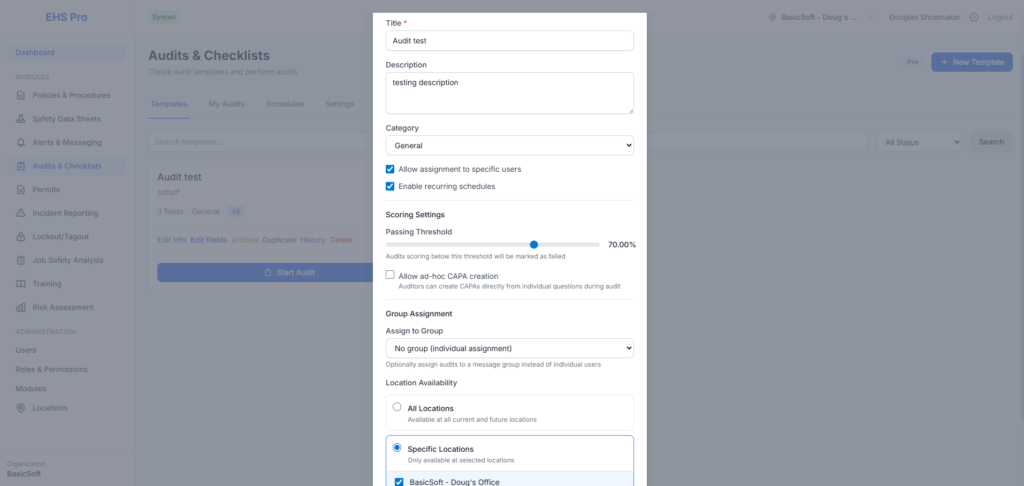 Set up recurring schedules and let EHSpro handle the rest. Audits appear automatically. Auditors get notified. Managers see what’s due.